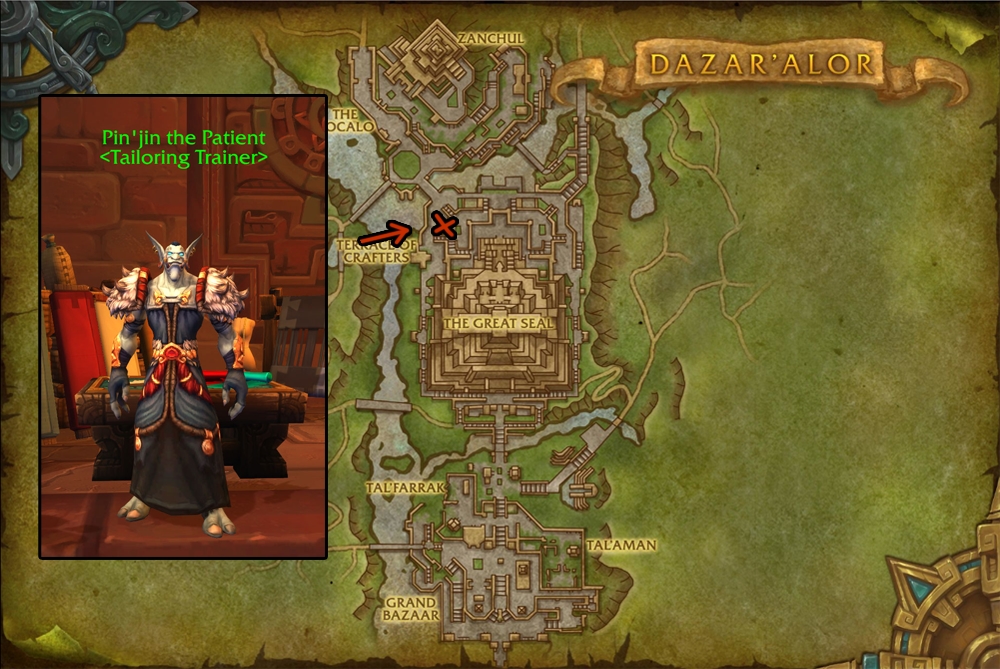 To get started on your profession quest line, speak with your profession trainer Pin'jin the Patient (Horde) in Dazar'alor or Daniel Brineweaver (Alliance) in Boralus. If you are having trouble finding the trainers, you can walk up to a guard in Dazar'alor or Boralus then ask where the Tailoring trainer is. Asking the guard will place a red marker on your map at the trainer's location.